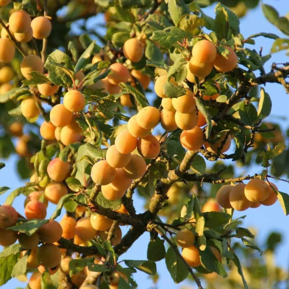 Mirabellier produisant de délicieuses petites prunes dorées, très parfumées et sucrées. Variété rustique et productive, idéale pour confitures et consommation fraîche.